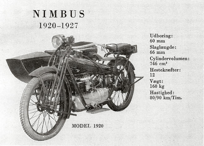NIMBUS 1920-1927 Bore: 60 mm Stroke: 66 mm Cubic capacity: 746 c.c. Power output: 12 HP. Weight: 160 kg Speed: 80-90 km/h