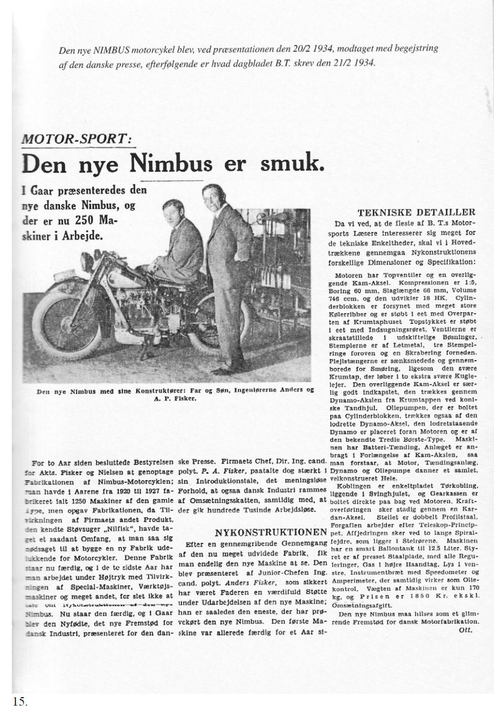 Two years ago the Board of Directors of Fisker and Nielsen Ltd. decided to resume production of motorcycles again; during the years 1920 until 1927 a total of 1250 of the previous type were built, but production was stopped as the manufacturing of the Company’s other product, the well known ‘Nilfisk’ vacuum cleaner, had become so voluminous, that they were [now] obliged to build a new plant, just for motorcycles. This factory was ready and during the last year staff have worked under immense pressure to build special equipment, tools and much more, not to mention design of the new Nimbus. It is now ready and yesterday the newly born machine, the latest promotion vehicle for the Danish industry, was presented to the Danish press. The Company’s Managing Director, Engineer P.A.Fisker strongly emphasised in his introduction speech the pointless fact that the Danish industry as well was suffering from the Value Added Tax (VAT) while, at the same time, hundreds of thousands were unemployed.