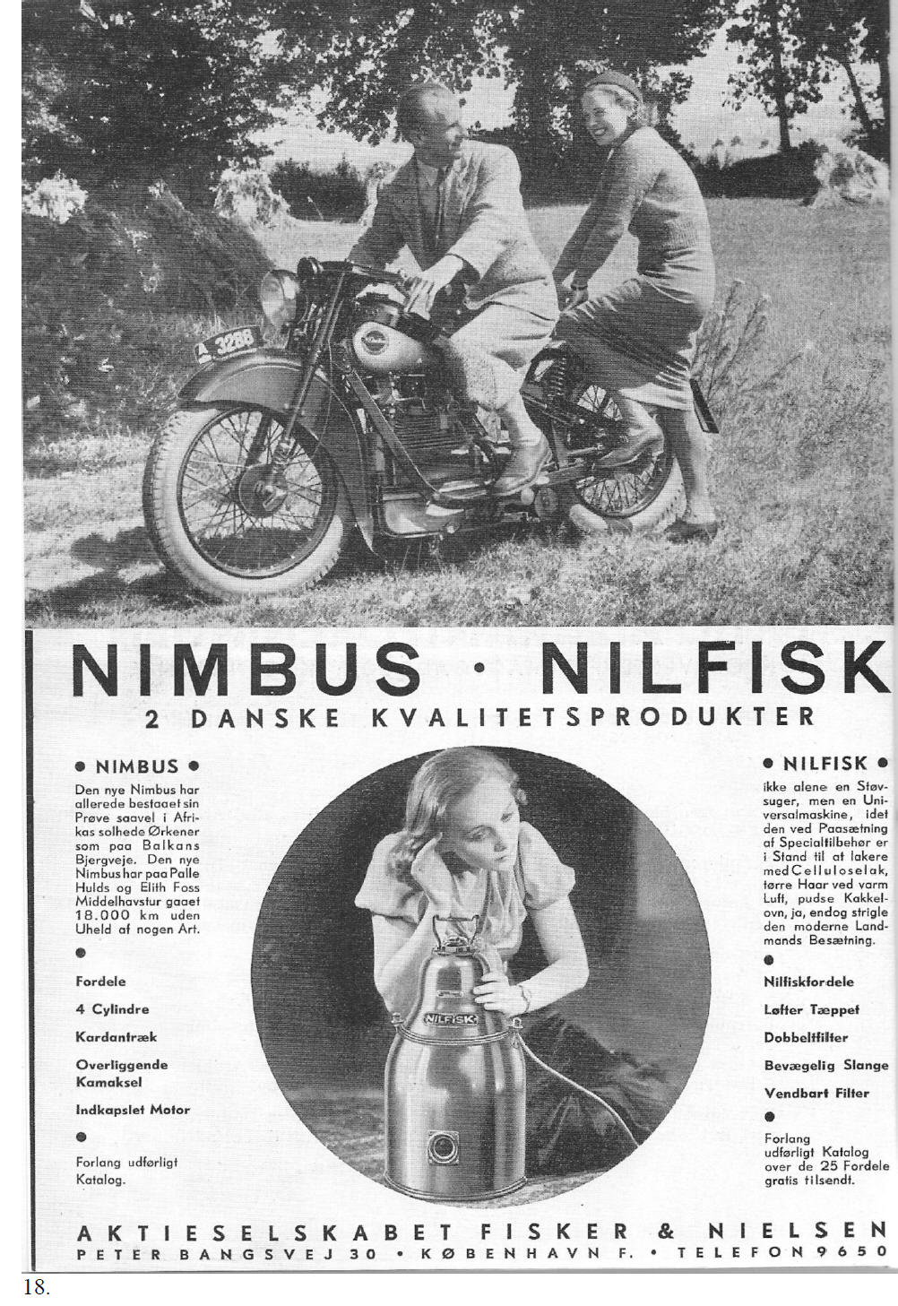 ·NIMBUS· The new Nimbus was tested in both the torrid African desert and on the mountain tracks of the Balkans. The new Nimbus has travelled 18.000 kilometres, without any breakdown, at the tour Palle Huld and Elith Foss made around the Mediterranean Sea. · Benefits 4 cylinders Shaft drive Overhead camshaft Enclosed engine · Ask for the comprehensive catalogue ·NILFISK· It’s not just a vacuum cleaner, but a universal machine, which will allow accessories to be fitted to spray cellulose lacquer, to dry your hair with hot air, to polish your stove, yes, and even to groom the cattle stock of the modern farmer.