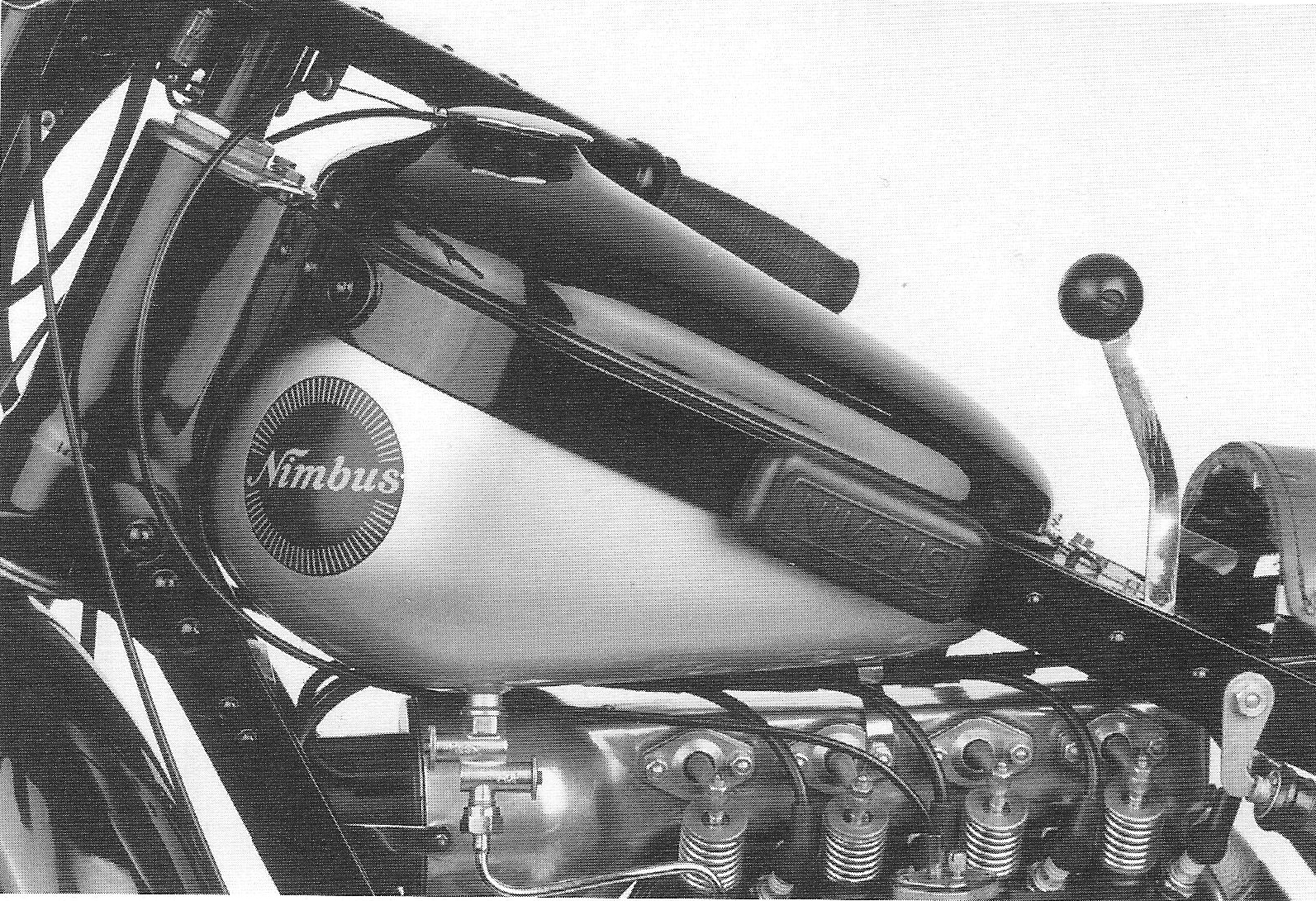 petrol tap fitted at the front base of the tank. The tank logo is a round, black transfer with a diameter of 86 mm with the name Nimbus and a golden halo. There is no rubber spacer between tank and frame. The petrol cap is chrome plated and has a 3 mm high edge.