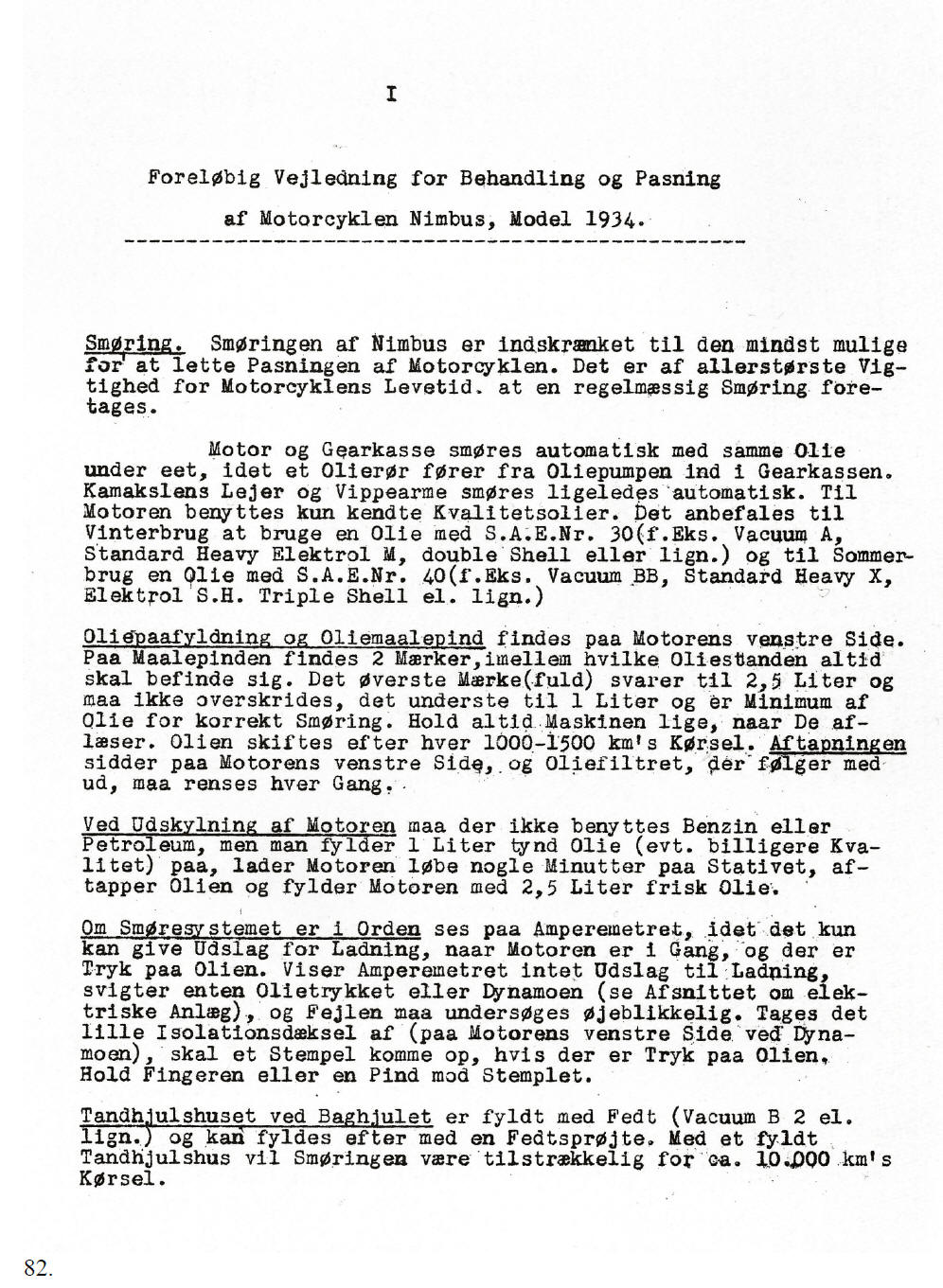 [Translation of page 82] Temporary manual for the use and maintenance of the 1934 Nimbus Motorcycle, Model C. Lubrication. The lubrication system on the Nimbus is not complicated and it is of the utmost importance for the life of the motorcycle that regular lubrication takes place. The engine and the gearbox are automatically lubricated with the same oil, via a lube oil pipe which runs from the lube oil pump to the gear box. The bearings of the camshaft and the rockers are automatically lubricated the same way. Only quality oils may be used for the engine. For winter use S.A.E. 30 oil, e.g. Vacuum A, Standard Heavy Elektrol M, double Shell or similar is recommended and for summer use S.A.E. 40 oil, e.g. Vacuum BB, Standard heavy X, Elektrol S.H., Triple Shell or similar.