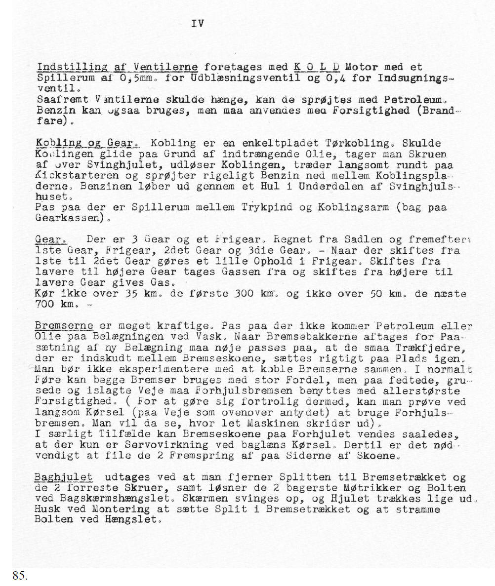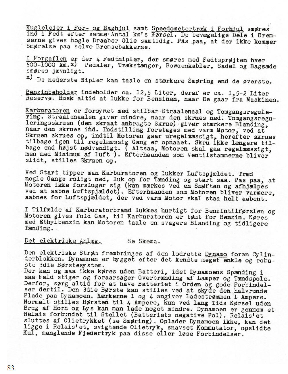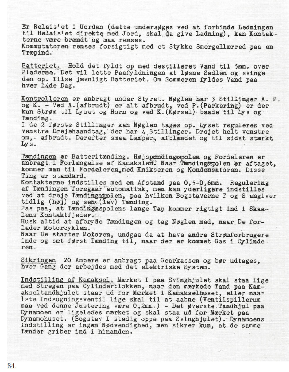 causing charging again. The battery. Keep it topped up with distilled water to 5 mm above the plates. This can be done by loosening the seat and tilting it forward. Check the battery at regular intervals. In summer, distilled water has to be added every fortnight. The ignition switch is located under the handle bars. The ignition key has three positions, A, P and K. – In position A (Afbrudt = off) everything is off, at P (Parkering = parking) there is only power available for lights and horn and at K (Kørsel = operating) there is power for both lights and ignition. In the first two positions the key can be taken out. The lights are operated with the left hand twist grip, which has four positions. Turning it fully to the left, - the lights are off, then parking lights, low beam and finally high beam.