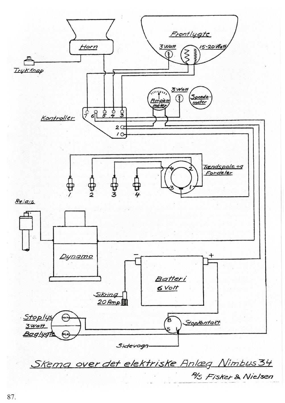 [Translation of page 87] Head light Horn 3 Watt 15-20 Watt Push button 3 Watt Ammeter Speedometer Switch Ignition coil and distributor Relay Dynamo Fuse 20A Battery 6 Volt Brake light 3 Watt Brake switch Rear light Sidecar