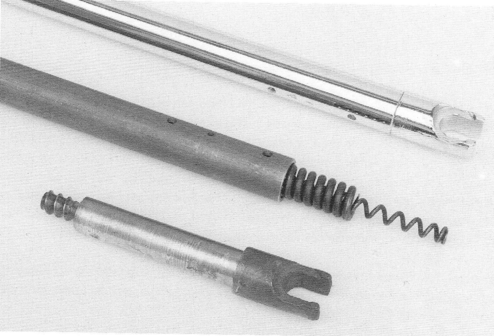 threaded plug. These circlip grooves were added later. It is very difficult to find an inner front fork tube, in an acceptable condition, but fortunately the tubes are replaceable. An hydraulic pipe with the dimensions Ř 25 x 2.5, which is on the shelf at most hardware stores, can serve this purpose. The lower 15 cm or so of the inner telescopic tubes are nickel plated. The spring system, which lies within the inner fork tubes, consists of thick, right-handed main springs with thin, left-handed additional springs inside. It is unclear whether or not the first telescopic forks had the inner springs fitted.