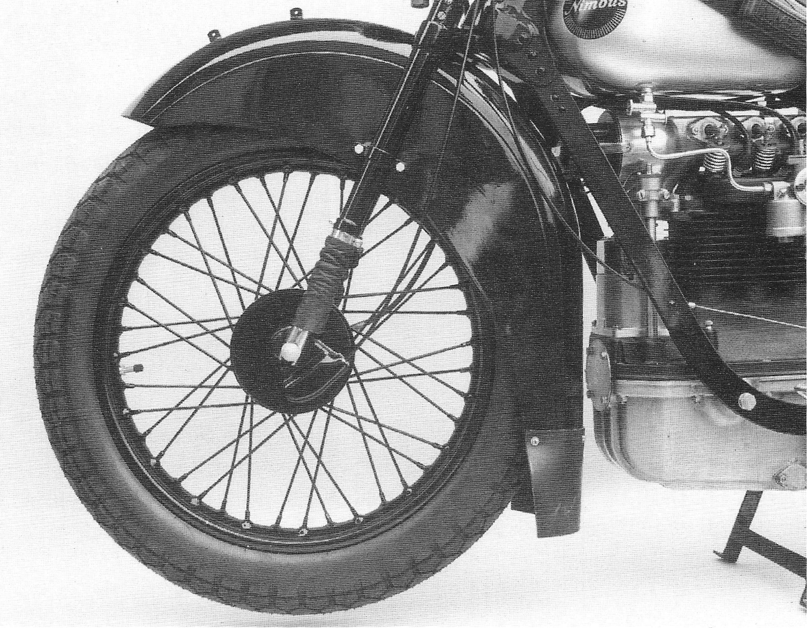 Front wheel with mud flap. The front wheel bearing is poorly protected against water and dirt on the right hand side, leading to the ball bearings seizing, resulting in the bearing disintegrating causing severe wear and damage to the bearing housing. Slight wear can be solved with “Loctite” when fitting a new bearing. Nowadays a bearing with a plastic seal must be used. 96.
